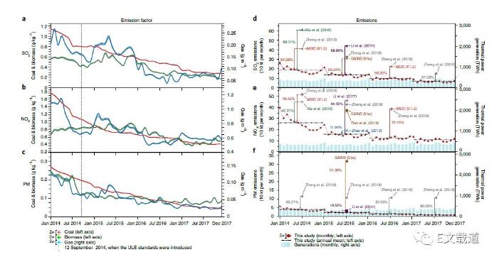圖(tu)3展示了(le)各(ge)污染物排(pai)放(fang)(fang)因子和(he)總的(de)排(pai)放(fang)(fang)的(de)變化。總的(de)來(lai)看,從2014年(nian)到2017年(nian),燃(ran)煤電(dian)廠(chang)的(de)SO2、NOx和(he)PM2.5的(de)月均排(pai)放(fang)(fang)因子分別下降了(le)75.33%、76.03%和(he)83.31%,對(dui)于生(sheng)物質電(dian)廠(chang)的(de)則為69.20%,25.06%和(he)64.90%,對(dui)于燃(ran)油(you)電(dian)廠(chang)的(de)為52.35%,46.87%和(he)76.94%。因此盡管2014年(nian)到2017年(nian)中(zhong)國發電(dian)量年(nian)均增長(chang)3.49%,整體排(pai)放(fang)(fang)還是保(bao)持(chi)下降。