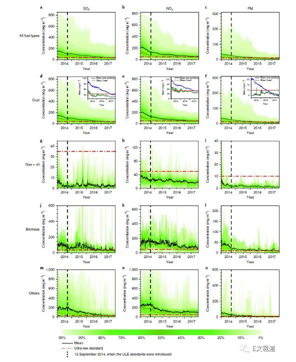 下圖展示(shi)了各個燃(ran)(ran)料(liao)類型的(de)(de)(de)電廠(chang)從2014到2017年的(de)(de)(de)三(san)種主要(yao)污染物的(de)(de)(de)日均(jun)濃(nong)度的(de)(de)(de)變化情況(kuang),黑線表示(shi)開始實施(shi)了超低排(pai)放限(xian)值標(biao)準。總體均(jun)呈下降(jiang)趨勢(shi),其中燃(ran)(ran)煤(mei)(mei)電廠(chang)的(de)(de)(de)下降(jiang)趨勢(shi)較(jiao)為顯著,SO2、NOx和(he)(he)PM2.5月(yue)均(jun)下降(jiang)2.82%、2.79%和(he)(he)3.65%。截至到2017年12月(yue)底(di),中國(guo)的(de)(de)(de)燃(ran)(ran)煤(mei)(mei)電廠(chang)煤(mei)(mei)電機組(zu)的(de)(de)(de)超低排(pai)放改造率總體達到72.30%,有望提前實現(xian)80%的(de)(de)(de)目標(biao)。
