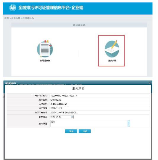 答:排污許可證發生遺失、損毀的,排污單位應當在三十個工作日內向核發生態環境部門申請補領排污許可證。排污單位登錄平臺后,點擊“許可證補辦”模塊,進入“遺失聲明”模塊,點擊“發布遺失聲明”按鈕,填寫并發布遺失聲明。在發布遺失聲明后,進入“許可證補辦”模塊提交補辦申請。