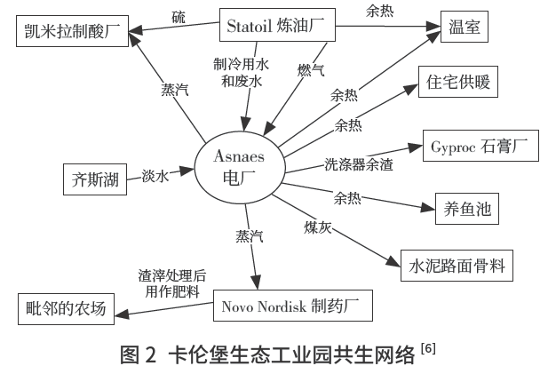 如(ru)圖2 所示,卡倫堡生態(tai)工(gong)業(ye)園以(yi)Asnaes 發(fa)電廠為核心,在過去(qu)的(de)(de)50 多年,共生關系并(bing)沒有經過宏偉的(de)(de)設計卻逐漸發(fa)展起來(lai),各個公司都在尋求經濟的(de)(de)方法(fa)使用其他公司的(de)(de)副產品,并(bing)盡量(liang)減少環(huan)境成本,形成了良性循環(huan),生態(tai)工(gong)業(ye)園得以(yi)運(yun)行發(fa)展。