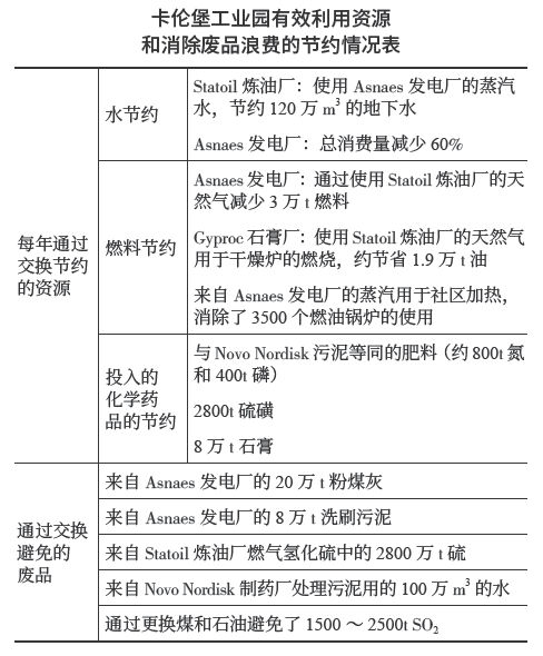 卡倫堡生態工業園(yuan)有效利用資源(yuan)和(he)消除(chu)廢品浪費的節約情況見下表(biao)。