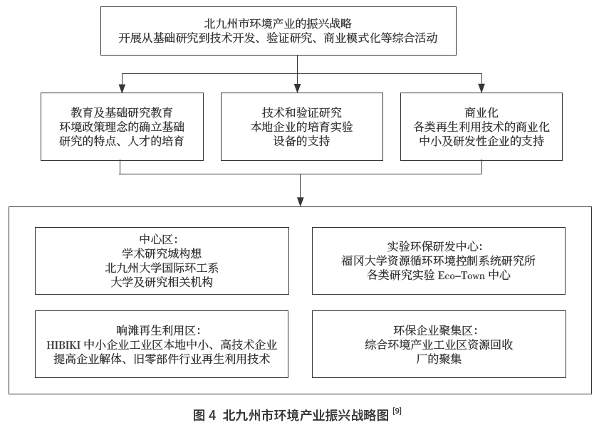 1997年,北九(jiu)州(zhou)(zhou)市(shi)成為(wei)日(ri)本第(di)一個獲得批準成立(li)發(fa)(fa)展(zhan)生態工(gong)業(ye)園區(qu)(qu)事業(ye)的(de)(de)(de)(de)區(qu)(qu)域。北九(jiu)州(zhou)(zhou)生態工(gong)業(ye)園的(de)(de)(de)(de)定位是(shi)(shi)要成為(wei)“亞洲國際資源循(xun)環(huan)和(he)(he)(he)環(huan)境工(gong)業(ye)基地城市(shi)”。1997 ~ 2002 年是(shi)(shi)第(di)一階段,目的(de)(de)(de)(de)是(shi)(shi)通過靜脈產業(ye)匯集(ji)達到工(gong)業(ye)和(he)(he)(he)環(huan)境保(bao)(bao)護共(gong)同結合發(fa)(fa)展(zhan);2002 年開(kai)始(shi)進入(ru)第(di)二階段,目的(de)(de)(de)(de)是(shi)(shi)建(jian)(jian)立(li)新型環(huan)境產業(ye),從(cong)而(er)拓寬(kuan)實驗研究的(de)(de)(de)(de)范圍、強化能力建(jian)(jian)設、吸引在廢物利用(yong)和(he)(he)(he)再(zai)制造方面(mian)有優勢的(de)(de)(de)(de)企(qi)業(ye)進入(ru)園區(qu)(qu)、開(kai)拓新能源技術(shu)和(he)(he)(he)納米技術(shu)等[8]。北九(jiu)州(zhou)(zhou)市(shi)環(huan)境產業(ye)振興戰(zhan)略如圖4所示,其中北九(jiu)州(zhou)(zhou)生態工(gong)業(ye)園區(qu)(qu)由4 個功(gong)能區(qu)(qu)組成,分別是(shi)(shi)中心區(qu)(qu)、環(huan)保(bao)(bao)研發(fa)(fa)中心、環(huan)保(bao)(bao)企(qi)業(ye)聚集(ji)區(qu)(qu)和(he)(he)(he)響灘再(zai)生利用(yong)區(qu)(qu)[8]。