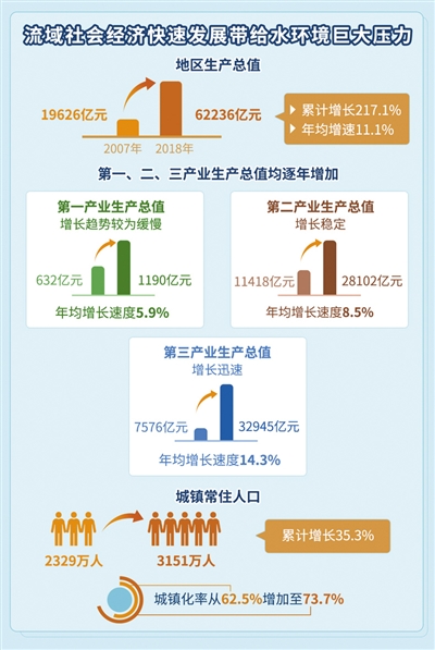 流(liu)(liu)域(yu)社會(hui)經濟(ji)(ji)快速(su)發展(zhan),使太湖(hu)流(liu)(liu)域(yu)水(shui)環(huan)境持(chi)續(xu)承受著巨(ju)大壓力。2007年(nian)(nian)到2018年(nian)(nian),近10年(nian)(nian)太湖(hu)流(liu)(liu)域(yu)經濟(ji)(ji)總量(liang)一直保(bao)持(chi)穩定增(zeng)(zeng)(zeng)長。地區生(sheng)產總值(zhi)從(cong)1.96萬億元(yuan)增(zeng)(zeng)(zeng)加(jia)至6.22萬億元(yuan),累計增(zeng)(zeng)(zeng)長217%,年(nian)(nian)均增(zeng)(zeng)(zeng)長速(su)度(du)11.1%。第一、二、三產業生(sheng)產總值(zhi)均逐年(nian)(nian)增(zeng)(zeng)(zeng)加(jia),年(nian)(nian)均增(zeng)(zeng)(zeng)長速(su)度(du)高達(da)5.9%~14.3%。伴隨著經濟(ji)(ji)增(zeng)(zeng)(zeng)長,流(liu)(liu)域(yu)人(ren)(ren)口累計增(zeng)(zeng)(zeng)長14.9%,其(qi)中(zhong)城鎮(zhen)(zhen)常住(zhu)人(ren)(ren)口由2329萬人(ren)(ren)增(zeng)(zeng)(zeng)長到3151萬人(ren)(ren),累計增(zeng)(zeng)(zeng)長35.3%。城鎮(zhen)(zhen)化(hua)(hua)率從(cong)62.5%提升(sheng)至73.7%,農業人(ren)(ren)口逐步向非農人(ren)(ren)口轉(zhuan)移,城鎮(zhen)(zhen)生(sheng)活年(nian)(nian)用(yong)水(shui)量(liang)增(zeng)(zeng)(zeng)加(jia)了約50%。如果沒有環(huan)保(bao)技術的(de)應用(yong)以(yi)降低(di)資源消耗和污(wu)染(ran)治理設施的(de)建(jian)設運行,工業經濟(ji)(ji)快速(su)發展(zhan)、城市化(hua)(hua)進程加(jia)速(su)、常住(zhu)人(ren)(ren)口增(zeng)(zeng)(zeng)加(jia)必然帶來(lai)工業廢水(shui)量(liang)的(de)增(zeng)(zeng)(zeng)加(jia)和污(wu)染(ran)負荷的(de)大幅(fu)增(zeng)(zeng)(zeng)加(jia)。