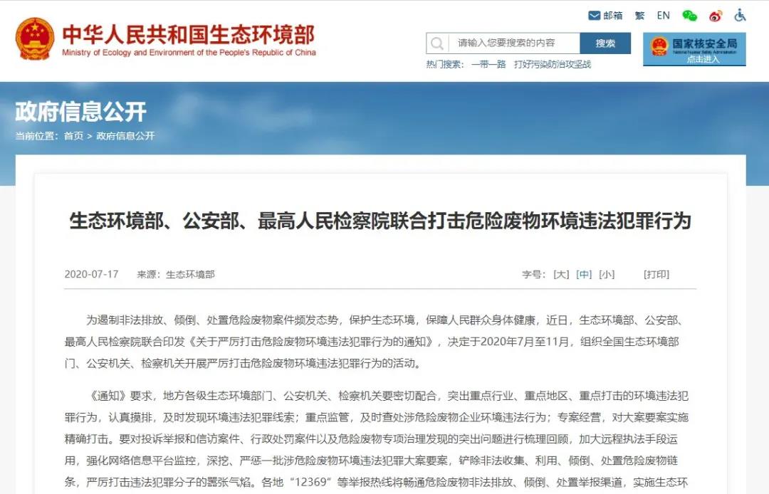 近日(ri),生(sheng)態環(huan)(huan)境(jing)部(bu)、公安部(bu)、最高人民檢察院聯合印發《關于(yu)(yu)嚴(yan)厲打(da)擊危(wei)險廢物環(huan)(huan)境(jing)違法(fa)犯罪(zui)行為的(de)(de)通知》,決定于(yu)(yu)2020年7月至11月,組織全國生(sheng)態環(huan)(huan)境(jing)部(bu)門(men)、公安機(ji)(ji)關、檢察機(ji)(ji)關開展嚴(yan)厲打(da)擊危(wei)險廢物環(huan)(huan)境(jing)違法(fa)犯罪(zui)行為的(de)(de)活動。