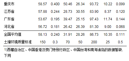 根據中國農田土壤重金屬平均含量統計,7種重金屬含量最高的行政區分別為:Cr74.90mg·kg-1(上海市)、Cd0.400mg·kg-1(重慶市)、Pb52.48mg·kg-1(福建省)、Cu35.50mg·kg-1(湖南省)、Zn107.98mg·kg-1(廣西壯族自治區)、As14.17mg·kg-1(廣西壯族自治區)以及Hg0.225mg·kg-1(福建省)。其中湖南、云南、貴州、四川、福建、廣西以及上海市農田土壤重金屬平均含量總體較高,而內蒙古、黑龍江、青海、新疆、遼寧、吉林以及寧夏回族自治區的平均含量較低。