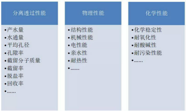 分離膜的性(xing)(xing)能(neng)由膜材料(liao)和(he)制膜工藝條(tiao)件決定。膜產品(pin)的相(xiang)關性(xing)(xing)能(neng)指標主要有分離透過性(xing)(xing)能(neng)、物理(li)性(xing)(xing)能(neng)和(he)化學性(xing)(xing)能(neng)三大類。