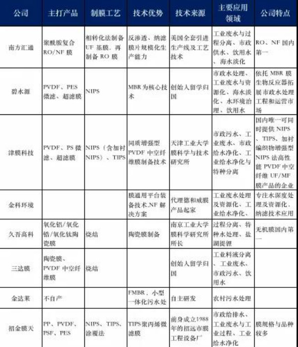 國(guo)內膜主(zhu)要上(shang)市(shi)公司(si)比較