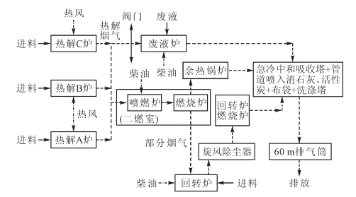 1、焚燒系統處置流程。熱解氣化燃燒系統主要即一燃室熱解氣化爐和二燃室燃燒爐組成,采用柴油作為助燃劑。熱解氣化爐(A、B、C 爐)交替循環使用,其中熱解氣化爐(C 爐)與廢液爐并聯(C 爐產生的高溫煙氣替代一次能源用于廢液爐的廢液加溫燃燒)。回轉爐焚燒系統燃燒煙氣首先通過旋風除塵器進行初級除塵,后引入回轉爐燃燒爐二燃室中進一步燃燒,產生的煙氣進入焚燒廢氣處理系統。回轉爐采用柴油助燃,并引入熱解氣化爐二燃室部分煙氣作為燃燒熱源。回轉爐二燃室設計溫度控制在 1100 ℃,煙氣停留時間為 2s 以上。廢液由廢液噴頭噴入廢液爐內進行霧化燃燒,燃燒燃氣經余熱爐換熱回收熱水后進入焚燒廢氣處理系統。廢液爐采用柴油作為輔助燃料,并配置串聯熱解爐(C 爐)產生高溫煙氣替代一次能源。廢液爐設計溫度控制在 1100 ℃,煙氣停留時間為 2s 以上。