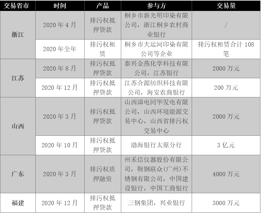 整體而言,排污權交易市場推出的融資工具數量不多,信息披露不全面。根據可得信息整理的融資工具情況如表1所示。2020年浙江、江蘇、廣東等東部省份繼續推動排污權融資工具,促進工業企業通過排污權抵質押貸款獲得資金用于節能減排、技術改造及流動資金補充等。參與企業以能源、電力、鋼鐵、印染、紡織等工業企業為主;參與金融機構除了建設銀行、工商銀行、興業銀行等四大行及大型股份制商業銀行外,還包括江蘇銀行、海安農商銀行、浙江桐鄉農村商業銀行等東部地區省市級商業銀行。未來預計將有更多工業發達省市的地區銀行參與本地排污權抵質押貸款項目,排污權融資方興未艾。