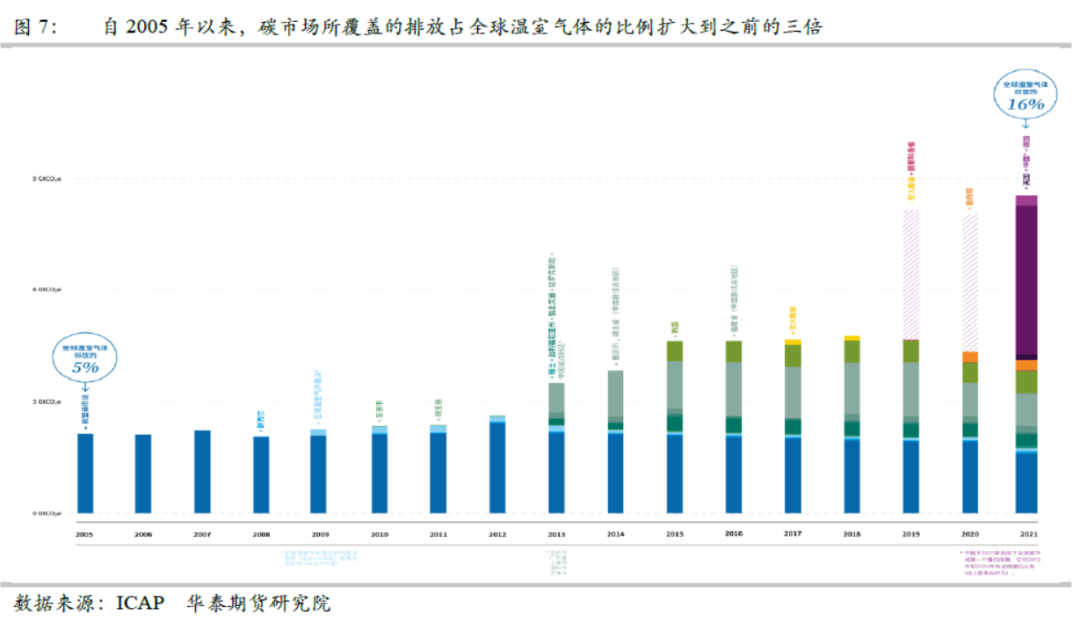 全(quan)(quan)球(qiu)碳(tan)市場配(pei)(pei)額(e)總(zong)(zong)量(liang)(liang):2005年歐盟碳(tan)市場啟(qi)動,配(pei)(pei)額(e)總(zong)(zong)量(liang)(liang)約21億(yi)噸(dun)CO2,占當時全(quan)(quan)球(qiu)溫室氣體排放(fang)量(liang)(liang)的(de)(de)比例約5%;隨后各地碳(tan)交(jiao)易(yi)市場逐漸建(jian)(jian)立(li),交(jiao)易(yi)總(zong)(zong)量(liang)(liang)上升,預(yu)計(ji)2021年隨著(zhu)中國全(quan)(quan)國性(xing)碳(tan)交(jiao)易(yi)市場的(de)(de)建(jian)(jian)立(li),全(quan)(quan)球(qiu)碳(tan)市場配(pei)(pei)額(e)總(zong)(zong)量(liang)(liang)預(yu)計(ji)將超過(guo)75億(yi)噸(dun),覆蓋量(liang)(liang)增至2005年的(de)(de)3倍(bei),占全(quan)(quan)球(qiu)溫室氣體排放(fang)量(liang)(liang)的(de)(de)比例提升至16%。