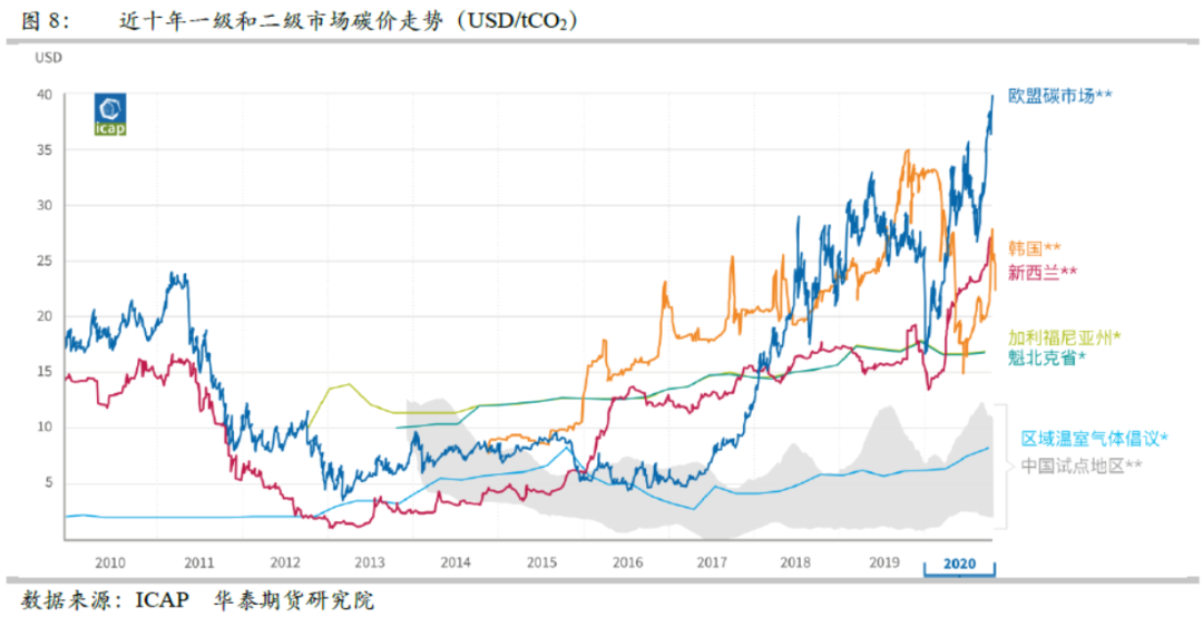 碳(tan)排放(fang)交易市(shi)(shi)(shi)場(chang)(chang)配額價格受市(shi)(shi)(shi)場(chang)(chang)供需狀況、外部政策、宏觀環境影響而表現出較(jiao)(jiao)大(da)的差異(yi)。縱向來看,隨著各(ge)地(di)區對碳(tan)市(shi)(shi)(shi)場(chang)(chang)的制度(du)設計(ji)逐(zhu)漸(jian)完善和(he)政府減排力度(du)的加強(qiang),近幾年碳(tan)排放(fang)交易價格呈現回升(sheng)趨勢;橫向來看,各(ge)碳(tan)市(shi)(shi)(shi)場(chang)(chang)交易價格差異(yi)較(jiao)(jiao)大(da),以2019年均價來看,歐盟和(he)韓國領跑全球,分別(bie)為(wei)27.8、25.6 USD/tCO2,美國區域溫室氣體倡議市(shi)(shi)(shi)場(chang)(chang)(RGGI)為(wei)6.0 USD/tCO2,中國8個(ge)碳(tan)交易試點(dian)(dian)市(shi)(shi)(shi)場(chang)(chang)均價在1.4-11.4 USD/tCO2,整(zheng)體均價較(jiao)(jiao)低,可能與(yu)是市(shi)(shi)(shi)場(chang)(chang)尚處(chu)于試點(dian)(dian)開發階段有關。