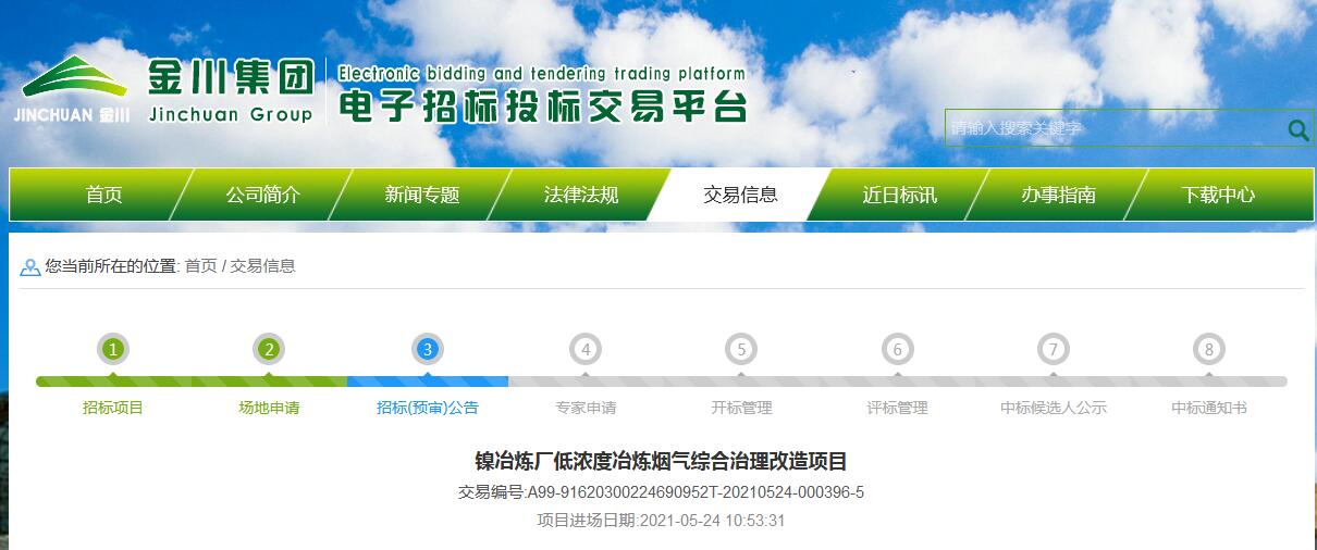 日前,金川集團發布鎳冶煉廠低濃度冶煉煙氣綜合治理改造項目招標公告。詳情如下: