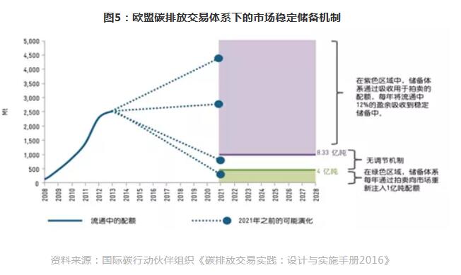 比如以歐盟為例,如前所述,歐盟在第二階段出現配額過剩的現象,贊成配額價格的大幅下跌,于是為動態維持配額的合理范圍,2015年,歐盟政策制定者通過了建立市場穩定儲備(MSR) 的決議。市場穩定儲備機制于2018年建立,2019年1月1日投入使用。市場穩定儲備的目的在于“解決目前配額盈余問題”和“通過調整待拍賣的配額供應量,提高碳交易體系抵御重大沖擊的能力”。市場穩定儲備機制將通過調整每年配額拍賣數量來發揮作用,觸發條件是流通中配額總數超出某一預先設定的范圍。當市場上用于拍賣的配額盈余超過某一預先設定的范圍之后,碳排放交易體系可以將一定比例的盈余吸收到市場穩定儲備中。反之,當配額盈余低于某一預先設定的范圍之后,碳排放交易體系則會從市場穩定儲備中釋放一定數量的配額回到市場。此外,若連續六個月中配額價格超過之前兩年平均配額價格的三倍,碳排放交易體系會從市場穩定儲備中釋放1億噸配額回到市場。