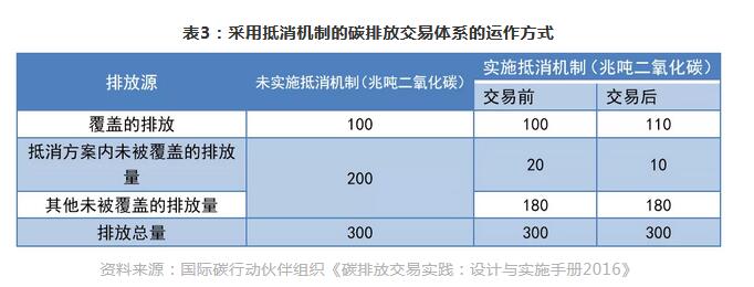 下表顯示,若不使用抵消機制,碳排放交易集體總量控制覆蓋的實體可排放100兆噸二氧化碳當量。若監管機構設計了抵消機制,規定目前排放量在20兆噸二氧化碳當量的未被覆蓋的排放源可獲得減排信用。于是該排放源選擇減排措施,實現排放量減半至10兆噸,并將剩余10兆噸二氧化碳當量減排量作為可買賣的減排信用出售給被覆蓋的排放源。被覆蓋的排放源因此可將排放量增加10兆噸二氧化碳當量,同時仍然不違反碳排放交易體系的總量控制規定(300噸保持不變)。這是迄今為止設計運行的多數抵消方案的典型代表[4]。
