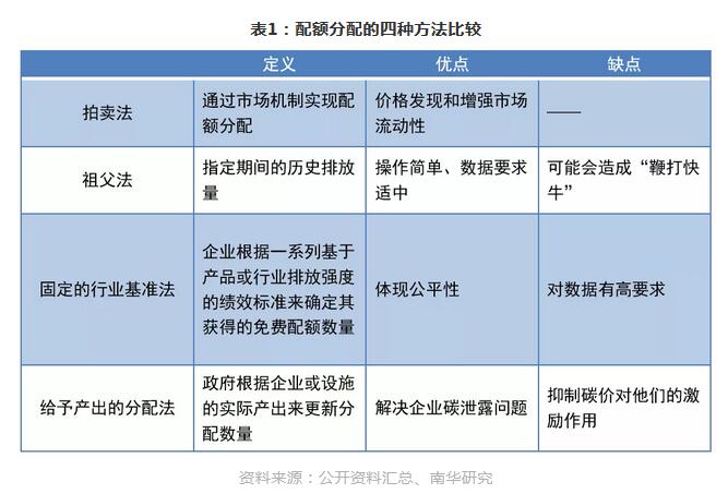 配額分配有兩種基本分配方法。政府既可選擇通過拍賣出售配額,又可選擇向參與者或其他有關主體免費發放配額。有鑒于免費配額可通過三種主要方法進行分配,因此配額分配共計有四種方法(拍賣和三種免費分配)。