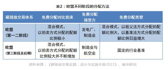 歐盟碳排放交易體系均采用混合模式,但免費分配和拍賣的比例分配隨著市場的成