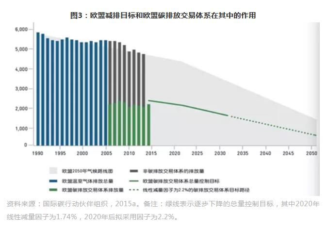 此外,還需要設定總量的時間跨度,總量可以以一年或多年來確定,通常與承諾減排期或碳排放交易體系的階段相對應。歐盟排放交易系統 (EU ETS)從2005年開始運營,下圖顯示歐盟碳排放交易體系目標與整體經濟范圍內減排目標的相關性。