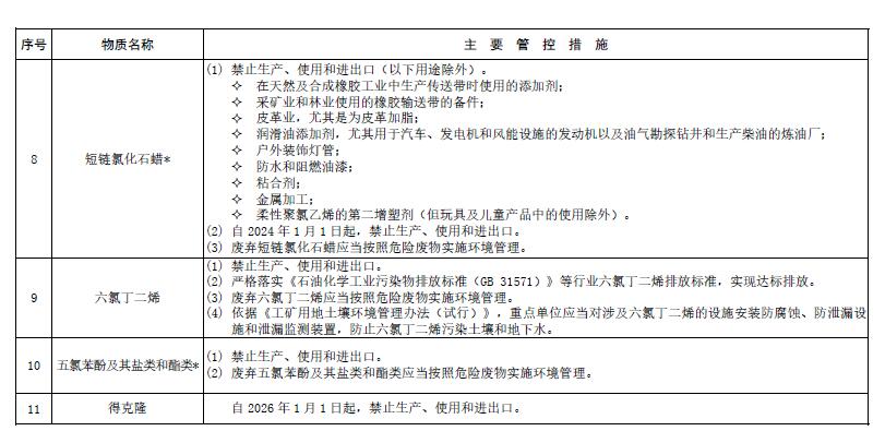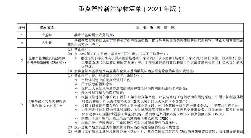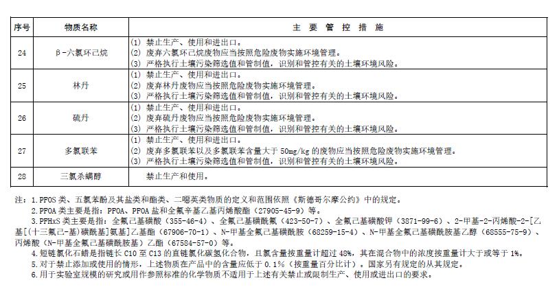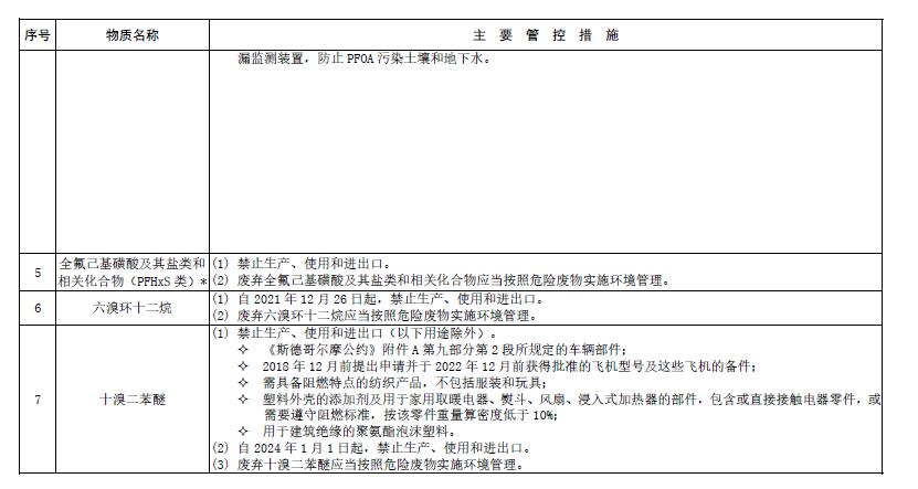 自2021 年12 月26 日起,禁止六溴環十二烷的生產、加工使用和進出口;到2022 年底,禁止銷售含塑料微珠的日化產品。2025 年底前,逐步禁止PFHxS 類、十溴二苯醚、短鏈氯化石蠟、五氯苯酚及其鹽類和酯類、六氯丁二烯、得克隆的生產、加工使用和進出口;嚴格限制PFOS 類、PFOA 類的生產和加工使用;禁止壬基酚用于農藥助劑;基本實現二噁英類全面達標排放。