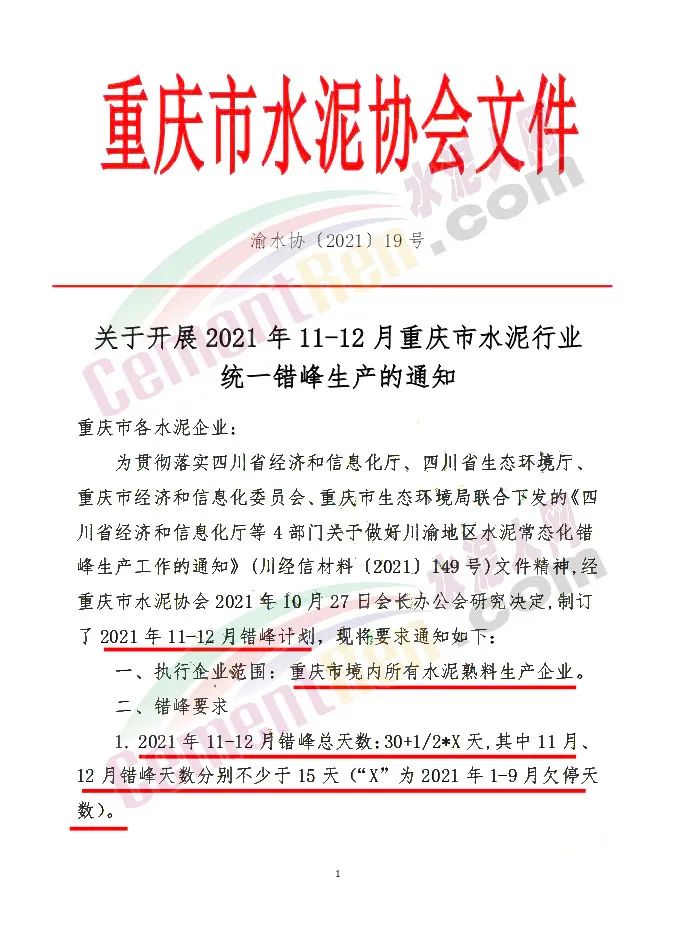 【谷騰環保網訊】10月28日重慶市水泥協會發布《關于開展2021年11-12月重慶市水泥行業統一錯峰生產的通知》稱,為貫徹落實四川省經濟和信息化廳、四川省生態環境廳、重慶市經濟和信息化委員會、重慶市生態環境局聯合下發的《四川省經濟和信息化廳等4部門關于做好川渝地區水泥常態化錯峰生產工作的通知》(川經信材料〔2021〕149號)文件精神,經重慶市水泥協會2021年10月27日會長辦公會研究決定,制訂了2021年11-12月錯峰計劃。