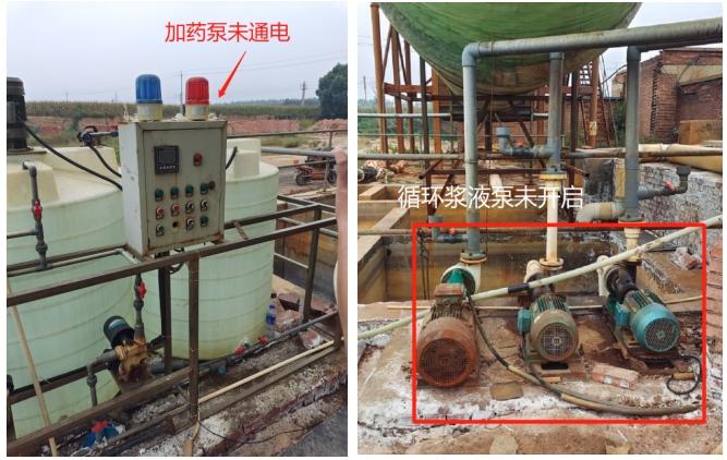 圖15 長治市潞城市元泰新型建材有限公司治污設施配套的加藥泵未通電(左);循環漿液泵未開啟(右)