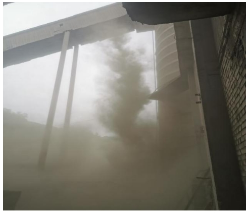 圖16 山西川東水泥有限公司熟料傳送廊道封閉不嚴,物料直接灑落,粉塵無組織排放嚴重