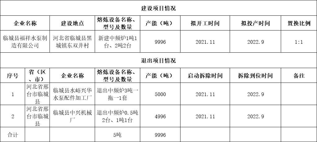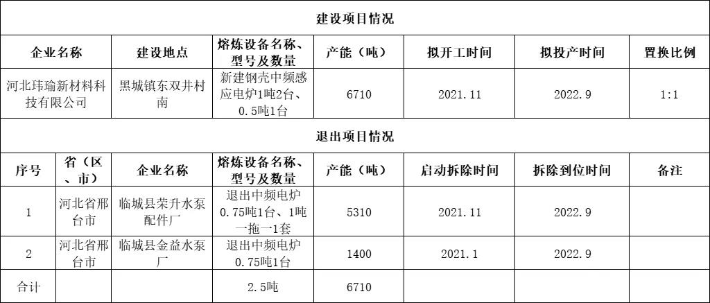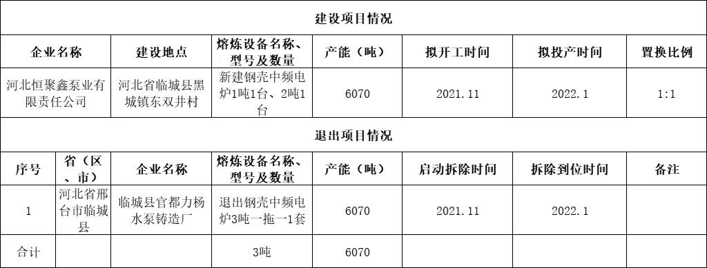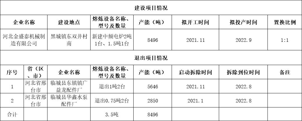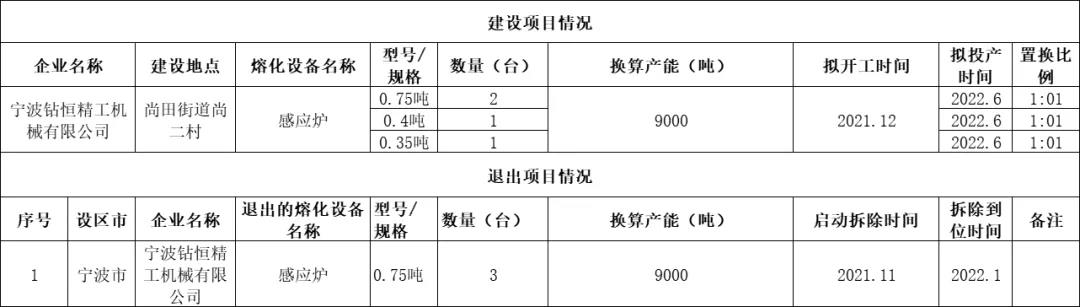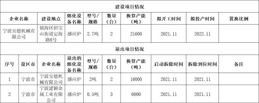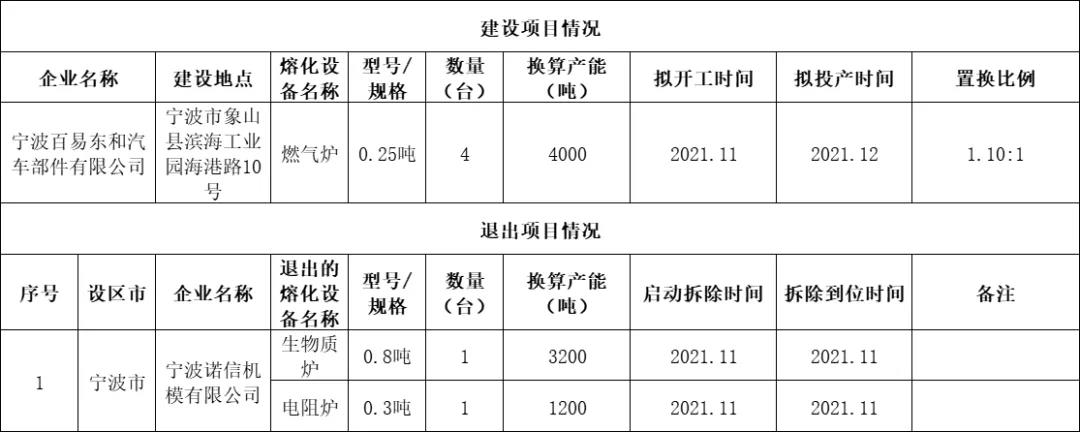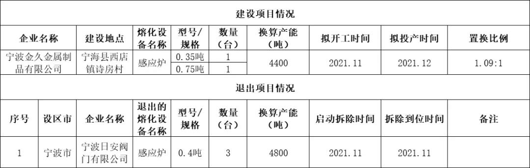 按照《國務院關于印發打贏藍天保衛戰三年行動計劃的通知》、《工業和信息化部辦公廳 發展改革委辦公廳 生態環境部辦公廳關于重點區域嚴禁新增鑄造產能的通知》和《浙江省鑄造行業產能置換實施辦法》等要求,寧波金久金屬制品有限公司等六項鑄造產能置換方案屬于設區市內產能置換,具體產能置換方案如下: