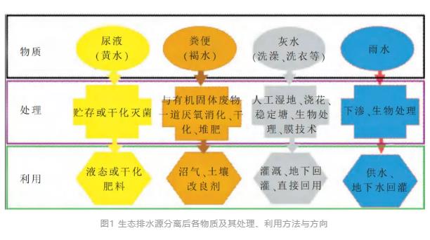 以源頭分離為基礎的分散式處理方式被稱之為“生態衛生(Ecosan) ”,是歐洲國家根據糞尿返田生態原理所設計的一種生態排水方式。通過在衛生潔具或排水系統設計上采用糞尿(黑水)或者尿液(黃水)、糞便(褐水)單獨收集、分別輸送方式而使之與灰水、雨水實現分離、返田,從而達到如圖1所示既生態又衛生的目的。
