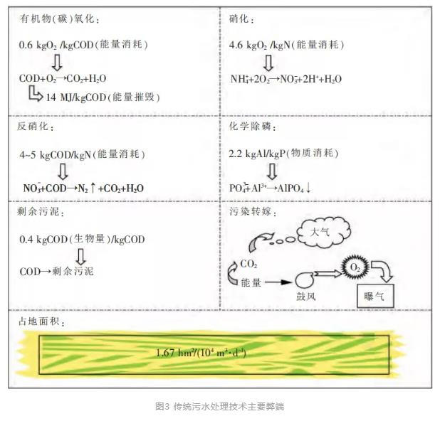 傳統污水處理技術主要弊端總結于圖3。作為污水中的主要有機污染物COD在傳統水處理過程中主要是依靠消耗化石能源供氧使其氧化,事實上COD是一種潛在的有機能源,每1kgCOD含14MJ的代謝熱,從這個意義上講,傳統污水處理實際上是“以能消能”。同時,消耗化石能源還會引起大量的CO2排放,造成水污染演變為大氣污染的“污染轉嫁現象”。此外,反硝化以及化學除磷需要日常消耗化學物質、產生大量剩余污泥、平面反應器占地過大等也是傳統污水處理工藝與生俱來的缺陷。
