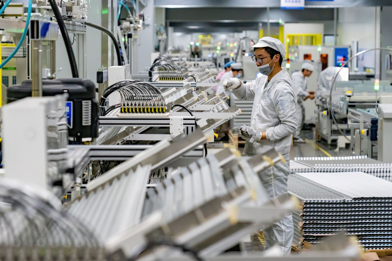 2022年1月5日,安徽省合肥市肥東縣合肥循環經濟示范園內的協鑫集成新能源科技有限公司1號廠房,工人正在進行裝框作業。阮雪楓/人民圖片