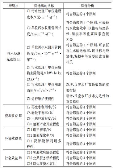 模型中準則層下的相應指標通過專家咨詢和技術調研篩選得出,同時遵循目標針對性、綜合指示性、數據可獲得性和指標可考性原則。表1為最終篩選出的16項評價指標。在指標篩選過程中,曾考慮管網單位建設成本、服務范圍管網密度、單位水資源回用收入、民眾滿意度、科普教育普及性等指標,但上述指標存在數據可獲得性較差、與已有指標關聯度高等問題,且這些指標的相關內容均可被最終篩選出的16項評價指標覆蓋。