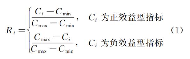 C1~C5采用離差標準化法對數據進行標準化處理[見式(1)]。該方法需要確定評價指標中的最大值(Cmax)和最小值(Cmin),否則每次評價時若最大值和最小值變化,就需要重新定義標準化函數,無法做到橫向統一對比不同方案。