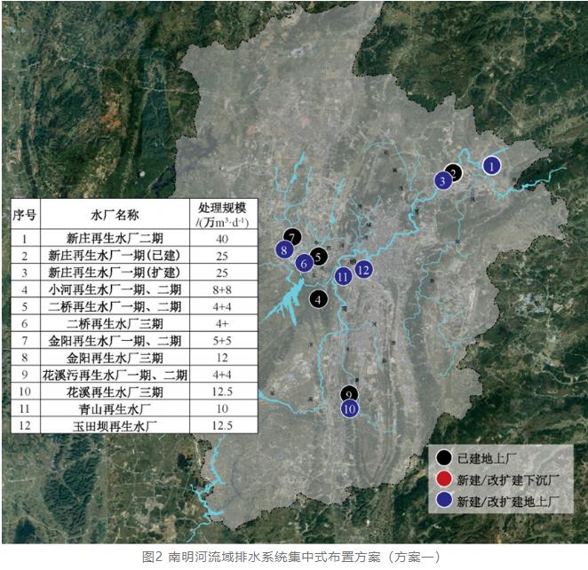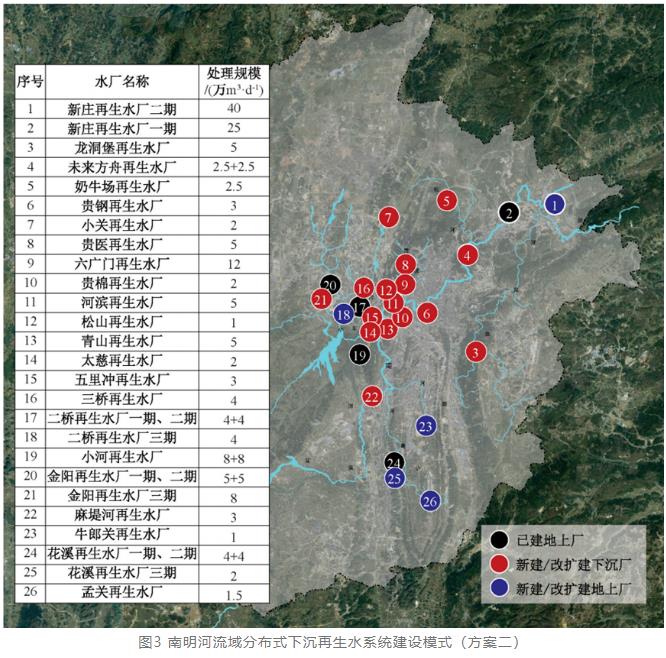 在南明河流域綜合治理之初提出了傳統集中式建設模式和分布式廠網建設模式兩種方案。圖2為按照原規劃思路編制的排水系統集中式方案,新建3座地上式污水處理廠(處理規模62.5萬m³/d),擴建4座地上式污水處理廠(處理規模53.5萬m³/d)。圖3為以“下沉式再生水廠”為核心,結合“適度集中、就地處理、就近回用”原則提出的分布式廠網建設模式,沿南明河干支流新建改擴建再生水廠23座,新增處理規模116萬m³/d。其中,下沉式污水處理廠17座(處理規模67.5萬m³/d),地上污水處理廠6座(處理規模48.5萬m³/d)。