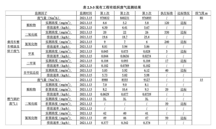 而技改環評報告指出,涂(tu)(tu)裝車間中(zhong)涂(tu)(tu)、面漆(qi)廢(fei)氣(qi)經(jing)簡(jian)單(dan)水(shui)旋濕(shi)式漆(qi)霧凈化措施(shi)處理后外排(pai);底漆(qi)、中(zhong)涂(tu)(tu)、面漆(qi)三個烘干室(shi)廢(fei)氣(qi)經(jing)直(zhi)燃處理后與噴涂(tu)(tu)廢(fei)氣(qi)合并(bing)外排(pai);電泳車間廢(fei)氣(qi)更是直(zhi)接無(wu)組織排(pai)放。