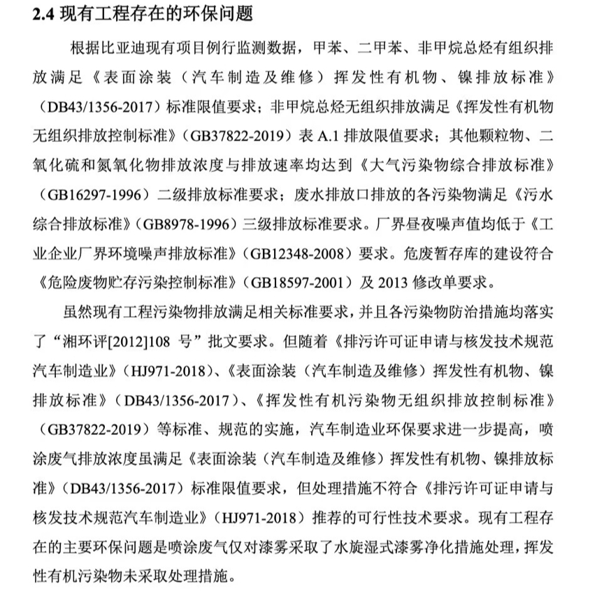 對此,技(ji)改環(huan)評報告(gao)2021年曾經(jing)指出(chu)長沙比(bi)亞迪(di)的(de)相(xiang)關情況:雖然現(xian)有工程污染(ran)(ran)物(wu)排放(fang)滿(man)足相(xiang)關標準(zhun)要(yao)(yao)求(qiu),并且各污染(ran)(ran)物(wu)防(fang)治措(cuo)施均落實了“湘(xiang)環(huan)評[2012]108號”批文(wen)要(yao)(yao)求(qiu),但是(shi),隨著《排污許可證(zheng)申(shen)請(qing)與(yu)核發(fa)技(ji)術規(gui)范汽車制造業(ye)(ye)》(HJ971-2018)等標準(zhun)、規(gui)范的(de)實施,汽車制造業(ye)(ye)環(huan)保(bao)要(yao)(yao)求(qiu)進(jin)一(yi)步提高,噴涂廢氣排放(fang)濃度雖滿(man)足標準(zhun)限值要(yao)(yao)求(qiu),可“噴涂廢氣僅(jin)對漆霧采取了水旋濕式漆霧凈化措(cuo)施處理(li),揮發(fa)性有機污染(ran)(ran)物(wu)未采取處理(li)措(cuo)施”不符合HJ971-2018推薦的(de)可行性技(ji)術要(yao)(yao)求(qiu)。