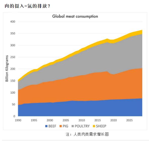 如上圖所示,由于人口增長或飲食結構的改善,肉類需求逐年遞增,2020年全球肉類消耗量相比90年增長了一倍多,而且預測仍然保持持續增長。實際上,關于肉類飲食與環境的相關性不僅僅存在于海洋氮輸入量。肉類飲食上升與溫室氣體排放也密切相關。據估計,由于肉類消耗量的增加,食品行業在2050年左右的碳排放量將會增加60%。因此,如何平衡我們對飲食改善的需求及環境保護似乎也是需要考慮和解決的矛盾之一,而可能的解決途徑包括基于植物或單細胞為基礎的替代肉品,以減少牲畜量;另外還包括綠色畜牧,像motral的產品或紅海藻這樣的飼料添加劑可以有效減少牛的甲烷排放,或者也可以在它們的飼料中加入更多的脂肪和蛋白質進而減少甲烷的排放。