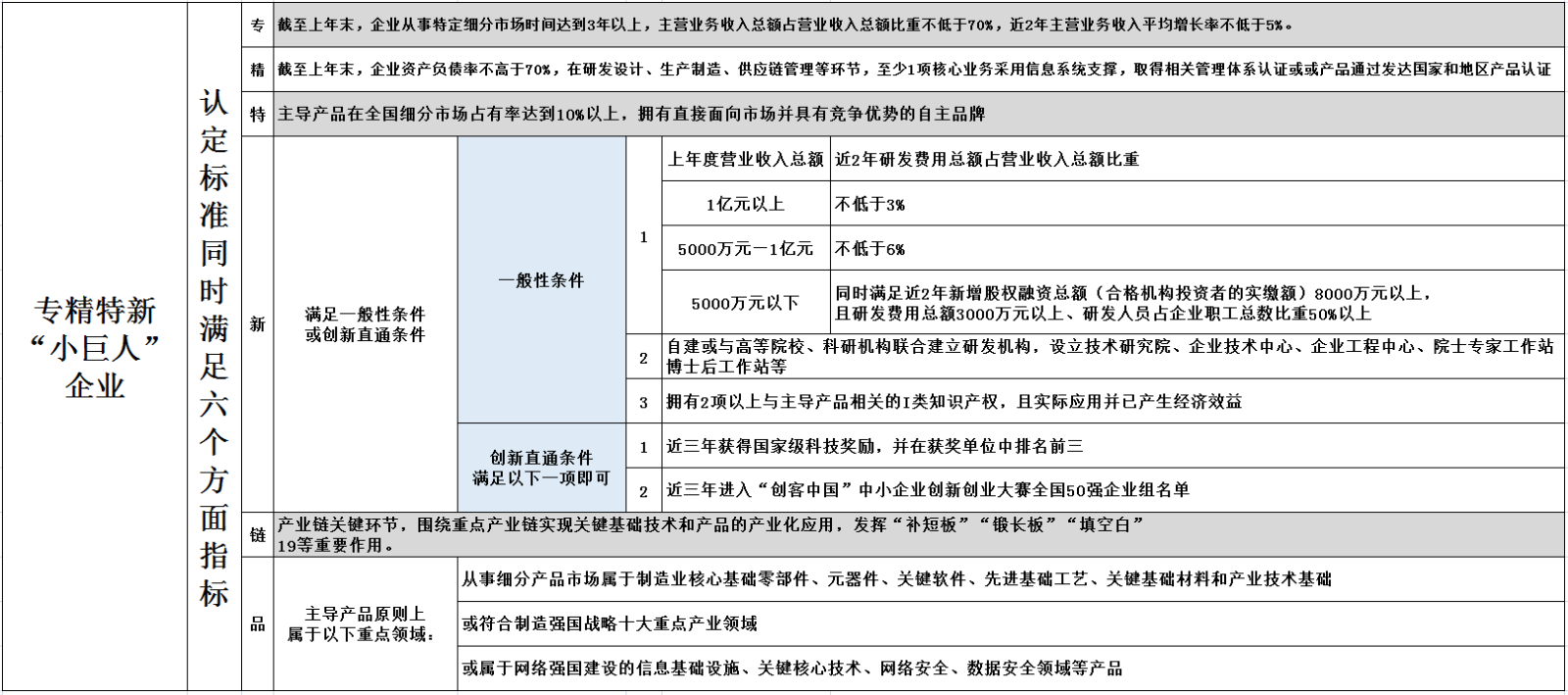 專精特新“小巨人”企業認定需同時滿足專、精、特、新、鏈、品六個方面指標。