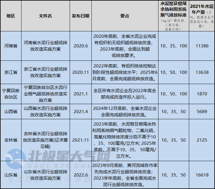 不只是山東,據(ju)北極星(xing)大氣網不完全統計,自2020年來(lai)已(yi)有(you)6省(sheng)(自治區)發布水泥超低排放改造方案,并給出明確(que)時間規劃(hua)。