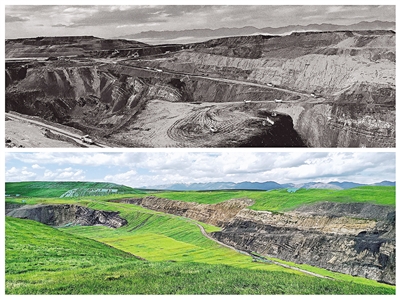 圖為青海省木里煤田江倉一號井的生態修復前后情況對比。