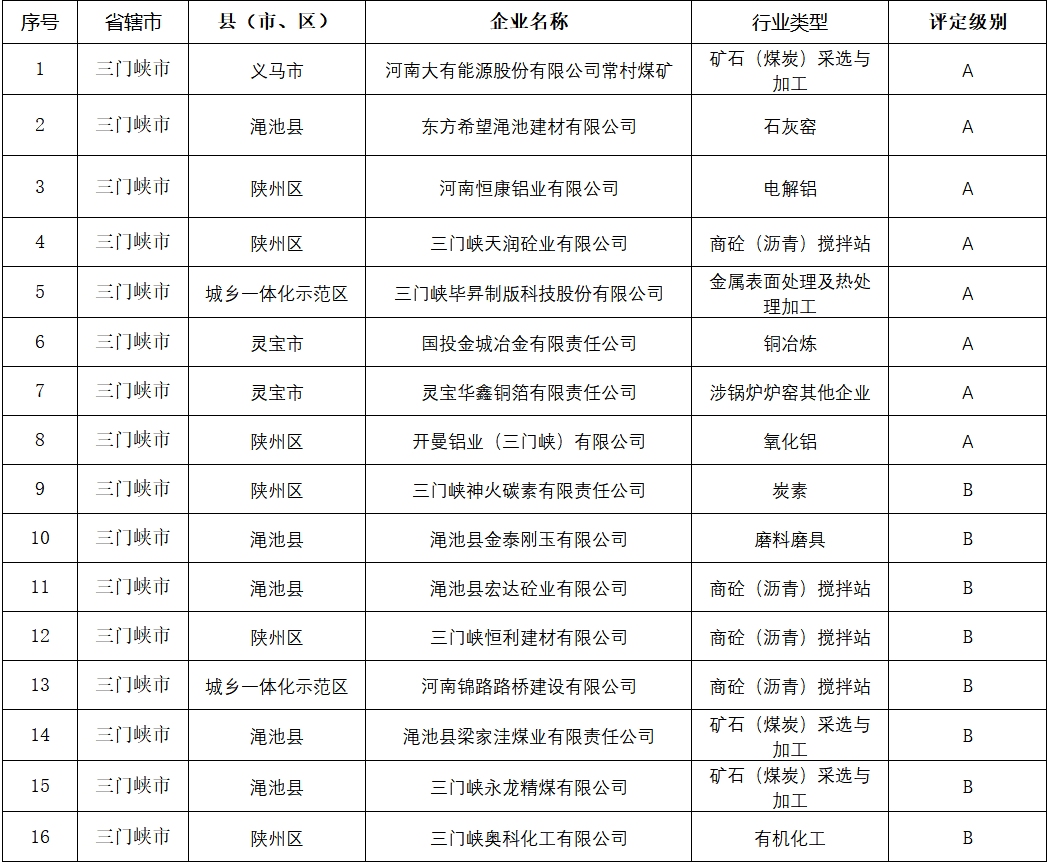 河南省三門峽市發布重污染天氣重點行業績效評級結果