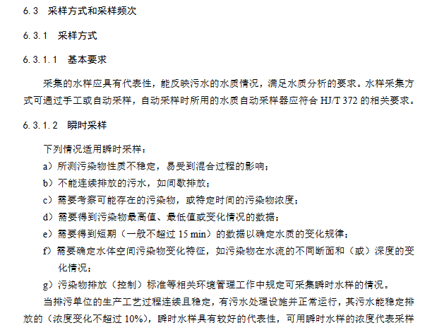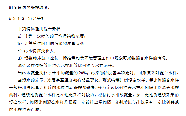 《污(wu)(wu)(wu)水(shui)監測(ce)(ce)技術(shu)(shu)(shu)規(gui)(gui)(gui)(gui)(gui)范》(HJ 91.1-2019)對兩種水(shui)樣采(cai)(cai)(cai)(cai)樣方(fang)(fang)(fang)式(shi)(shi)和采(cai)(cai)(cai)(cai)樣頻次(ci)(ci)的(de)規(gui)(gui)(gui)(gui)(gui)定(ding)(ding)(ding)。與《城鎮污(wu)(wu)(wu)水(shui)處(chu)理廠污(wu)(wu)(wu)染(ran)(ran)物排放標準》(GB 18918-2002)規(gui)(gui)(gui)(gui)(gui)定(ding)(ding)(ding)的(de)是(shi)污(wu)(wu)(wu)水(shui)處(chu)理廠安(an)裝(zhuang)在(zai)線監測(ce)(ce)裝(zhuang)置所應執(zhi)行的(de)取樣方(fang)(fang)(fang)式(shi)(shi)和頻次(ci)(ci)并未(wei)明(ming)確規(gui)(gui)(gui)(gui)(gui)定(ding)(ding)(ding)手工監測(ce)(ce)的(de)方(fang)(fang)(fang)式(shi)(shi)與頻次(ci)(ci)不(bu)同(tong)的(de)是(shi),《污(wu)(wu)(wu)水(shui)監測(ce)(ce)技術(shu)(shu)(shu)規(gui)(gui)(gui)(gui)(gui)范》(HJ 91.1-2019)規(gui)(gui)(gui)(gui)(gui)定(ding)(ding)(ding)的(de)是(shi)污(wu)(wu)(wu)水(shui)處(chu)理廠安(an)裝(zhuang)在(zai)線監測(ce)(ce)裝(zhuang)置所應執(zhi)行的(de)取樣方(fang)(fang)(fang)式(shi)(shi)和頻次(ci)(ci)并未(wei)明(ming)確規(gui)(gui)(gui)(gui)(gui)定(ding)(ding)(ding)手工監測(ce)(ce)的(de)方(fang)(fang)(fang)式(shi)(shi)與頻次(ci)(ci)該規(gui)(gui)(gui)(gui)(gui)范規(gui)(gui)(gui)(gui)(gui)定(ding)(ding)(ding)了污(wu)(wu)(wu)水(shui)手工監測(ce)(ce)技術(shu)(shu)(shu)要求,執(zhi)法部門在(zai)日常執(zhi)法中(zhong)對污(wu)(wu)(wu)水(shui)處(chu)理廠排放的(de)一般污(wu)(wu)(wu)染(ran)(ran)物種類監測(ce)(ce)采(cai)(cai)(cai)(cai)用的(de)是(shi)手工監測(ce)(ce)方(fang)(fang)(fang)式(shi)(shi),按(an)照《污(wu)(wu)(wu)水(shui)監測(ce)(ce)技術(shu)(shu)(shu)規(gui)(gui)(gui)(gui)(gui)范》瞬時(shi)采(cai)(cai)(cai)(cai)樣,瞬時(shi)水(shui)樣的(de)濃(nong)度代表采(cai)(cai)(cai)(cai)樣時(shi)間段內的(de)采(cai)(cai)(cai)(cai)樣濃(nong)度。