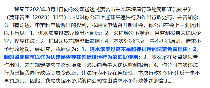 而昨天(tian)發布(bu)的(de)茂名市(shi)生態環(huan)境局的(de)案(an)例(li)則恰(qia)恰(qia)相反,其(qi)在反駁污水(shui)處理公(gong)司的(de)申辯意見(jian)中時明確指出(chu):“瞬(shun)時監(jian)測值可以作(zuo)為(wei)認定是否存在超標排污行(xing)為(wei)的(de)證(zheng)據使用(yong)。”