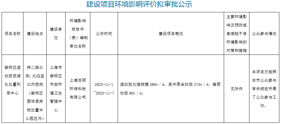 上海崇明區濕垃圾資源化處置利用中心環評擬審批公示