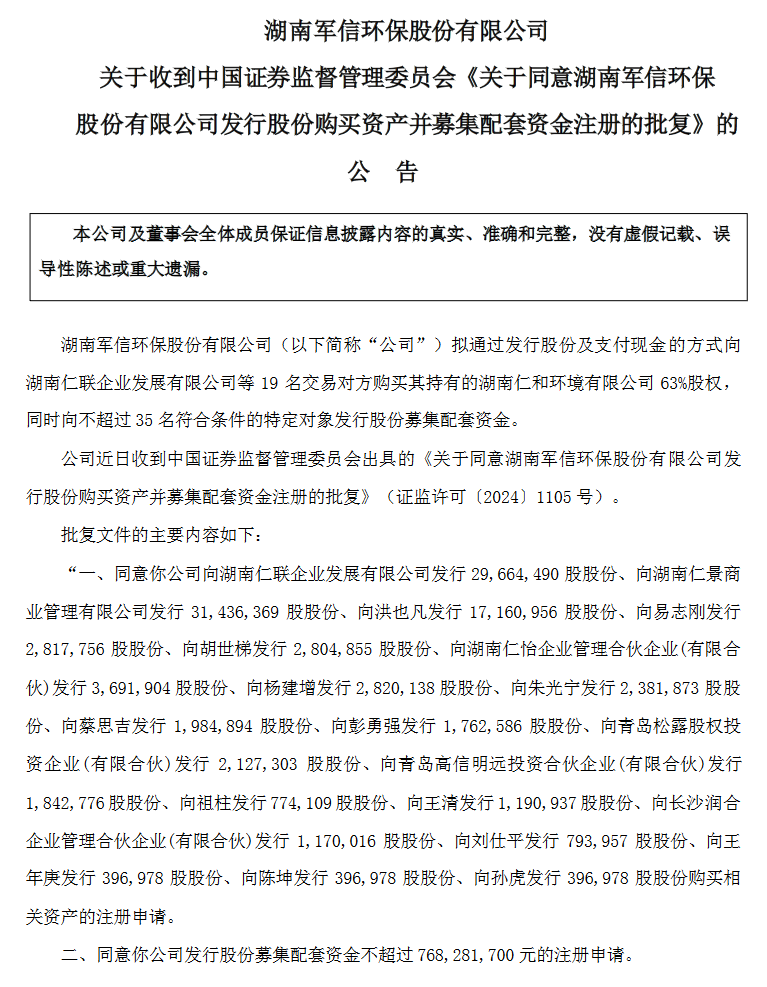 【谷騰環保網訊】獲悉,8月5日,深交所官網顯示,湖南軍信環保股份有限公司通過發行股份及支付現金的方式購買湖南仁和環境股份有限公司(以下簡稱“仁和環境”)63%股權,同時向不超過35名符合條件的特定對象發行股份募集配套資金事宜獲證監會同意注冊批復。