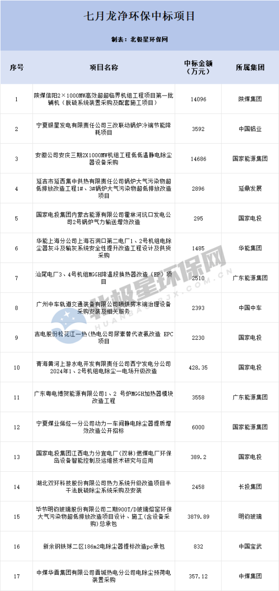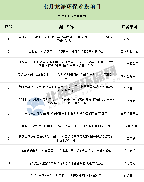 7月(yue),龍凈環保持續發力,項(xiang)目一直(zhi)拿個(ge)不停,各類中(zhong)標信息頻出。據(ju)北極星環保網不完(wan)全統計,7月(yue)龍凈環保合計中(zhong)標17個(ge)項(xiang)目,總金(jin)額(e)約為6.21億(yi)元(yuan)。值得(de)注意(yi)的是7月(yue)龍凈環保還(huan)參投12個(ge)項(xiang)目。