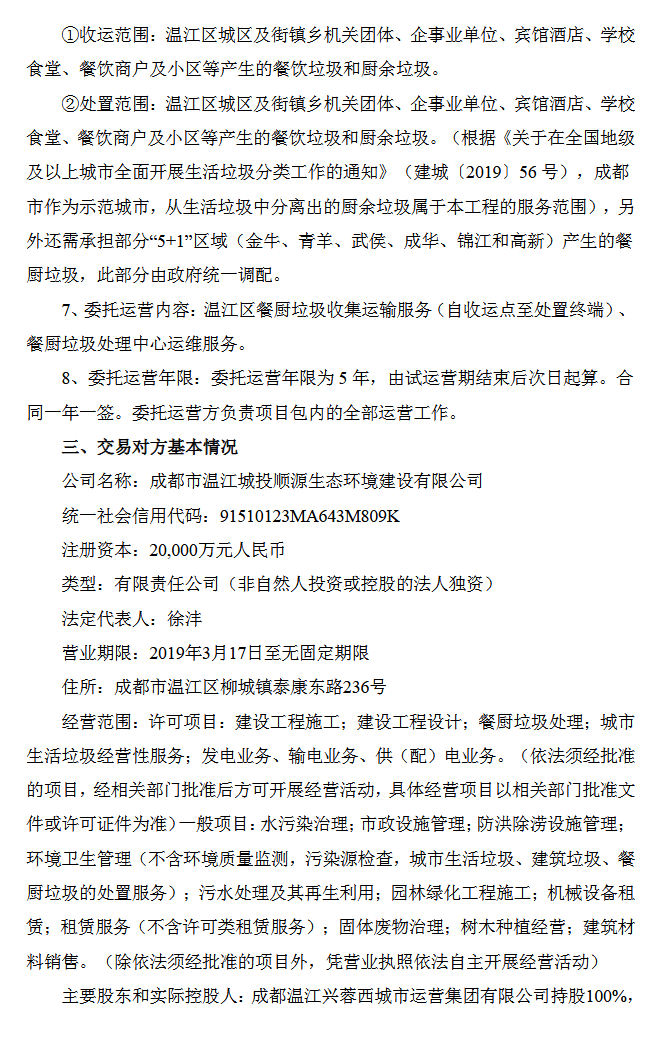 【谷騰環保網訊】為聚焦餐廚有機廢棄物處理及廢棄食用油脂資源化利用業務整體戰略發展規劃,山高環能下屬公司山高十方環保能源集團有限公司擬參與成都市溫江城投順源生態環境建設有限公司承建的溫江區餐廚垃圾處理中心(一期)委托運營服務投標,提供溫江區餐廚及廚余垃圾的收運、處置服務。
