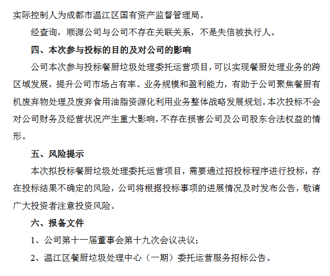山高環能:下屬公司擬參與投標餐廚垃圾處理委托運營項目