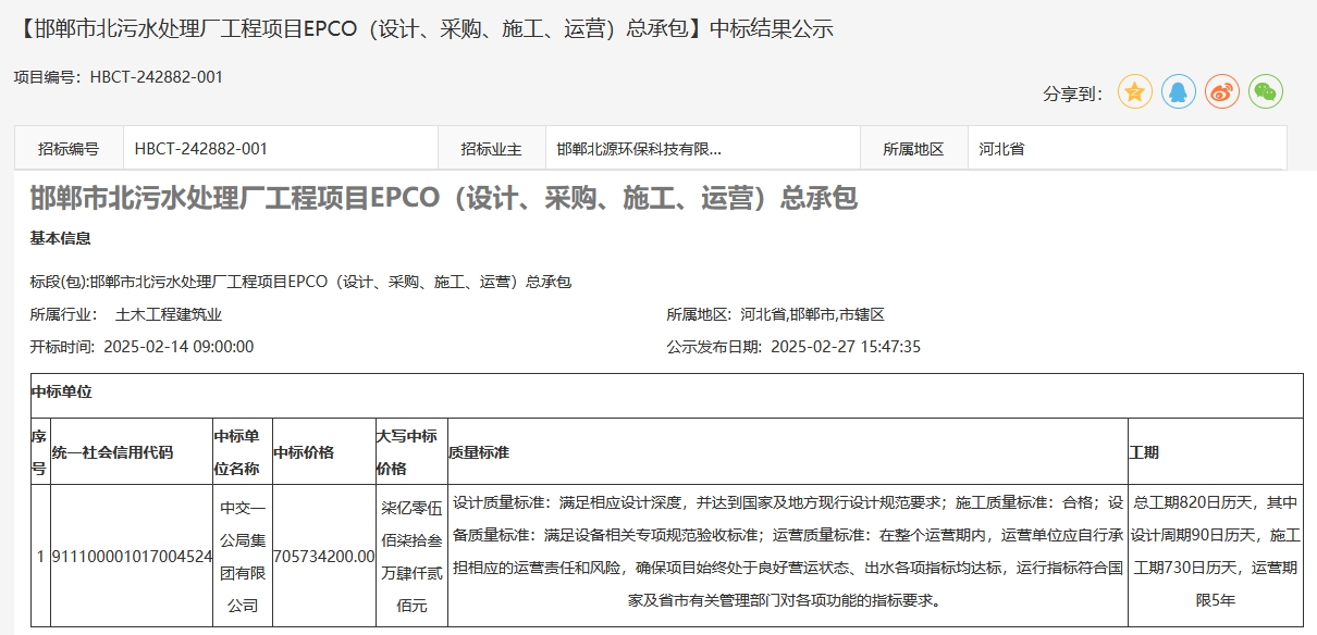 超7億!中交一公局中標邯鄲污水EPCO