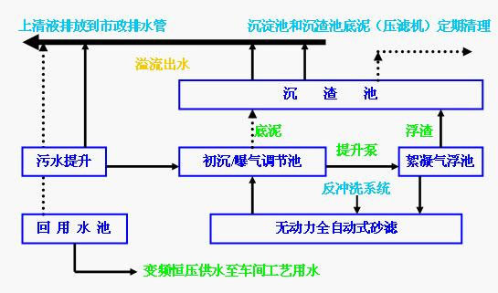 本工藝流程采用物化沉淀后絮凝氣浮工藝進行處理,是基于陶瓷加工行業用水水質特性和回用水要求上的最佳工藝。