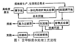 ①高濃度含甲醇廢水通過精餾塔進行預處理,回收97%以上的甲醇,這既有一定的經濟效益,又把高濃廢水的COD值控制在合理的范圍內,為后續處理減輕壓力。精餾后廢水水質指標見表1。