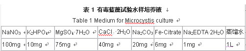 純種藍藻菌株Microcystis viridis 取自日本國立環境研究所生物保存棟,將此菌種接種于盛有250mL培養液(表1)的500mL三角燒瓶中,培養液事先在121℃條件下滅菌20min。